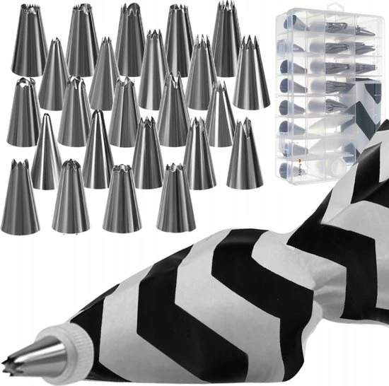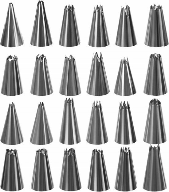 Deze set heeft maar liefst 24 verschillende spuitmondjes in de set, waardoor je gemakkelijk en snel verschillende decoraties op desserts en meer kunt toveren .