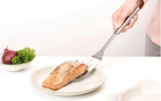Een stijlvolle keuken met een Brabantia Profile Bakspaan. Overtollig braadvet hoort niet bij een lekkere maaltijd. Deze bakspaan, van veerkrachtig roestvrij staal, is zo gemaakt dat het teveel aan vet door de sleuven weg kan.