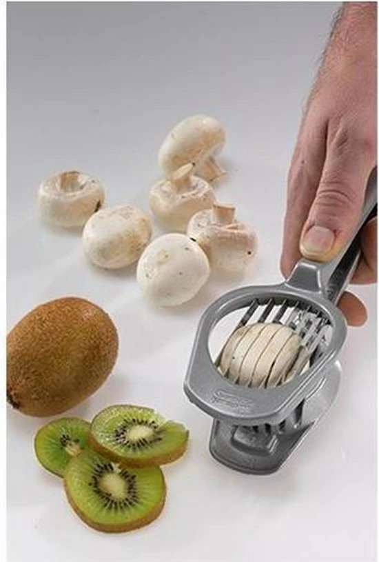 Voor het in schijfjes snijden van champignons, aarbeien, kiwi’s etc. Vervaardigd van hoogwaardig drukgiet aluminium en RVS mesjes. Met speciale levensmiddelencoating.