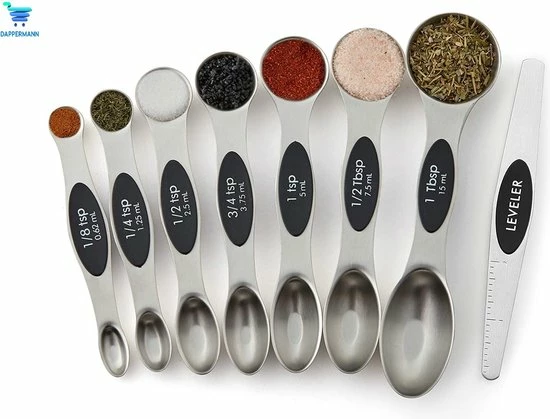Meet gemakkelijk, nauwkeurig en snel alle soorten vaste en vloeibare ingrediënten met deze Luxe Maatlepelset van Dappermann voor koken en bakken. Klaar om jouw baksels en gerechten perfect op smaak te brengen zonder te knoeien?