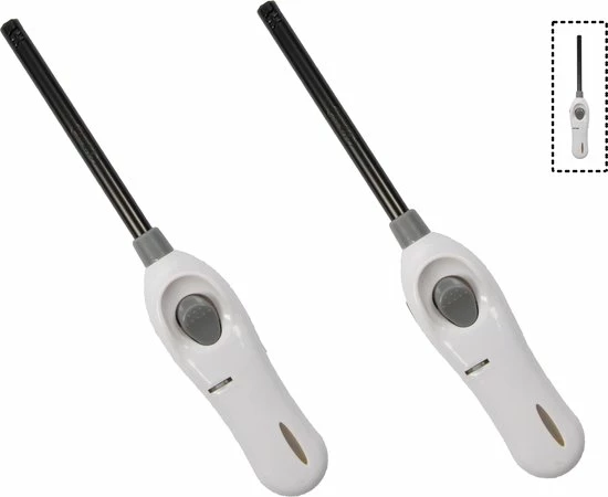 Pakket van 2x stuks barbecue aanstekers/gasaanstekers Wit 26 cm. Deze navulbare aansteker met gekleurd handvat heeft een lengte van ongeveer 26 cm. U kunt de grootte van de vlam zelf regelen en er zit een kinderslot op de aanstekers. Gasfornuis/barbecue/bbq/kaars aanstekers.