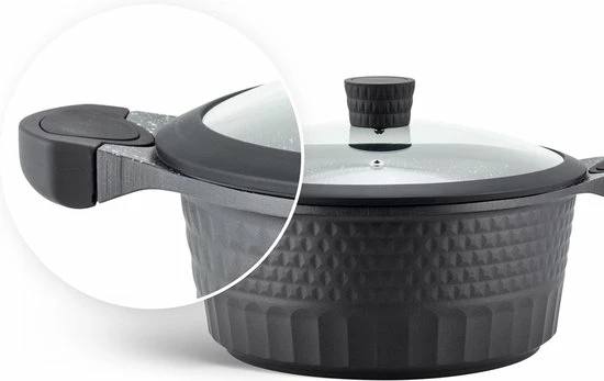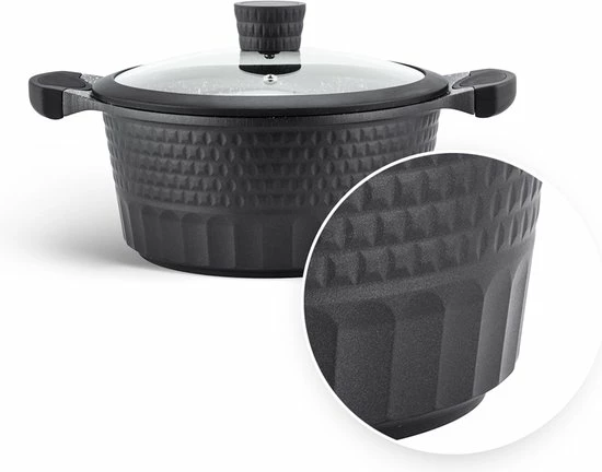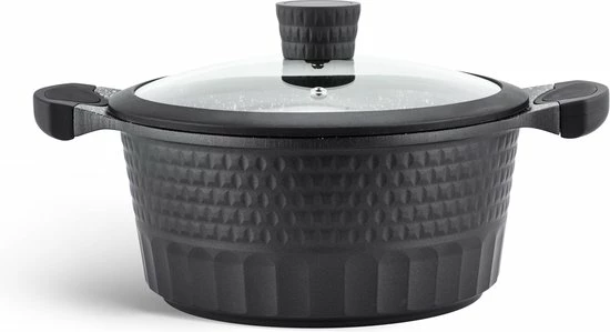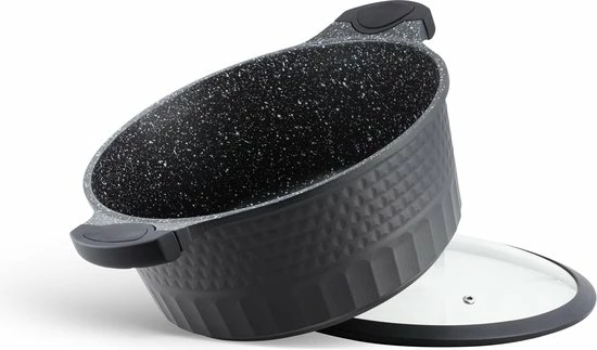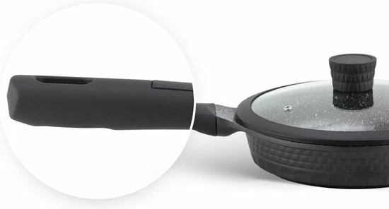 - Gegoten aluminium, met keramische/marmeren coating, ideaal voor aanbraden, en vetarm koken