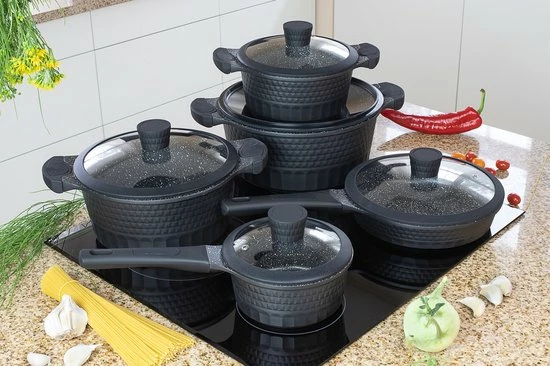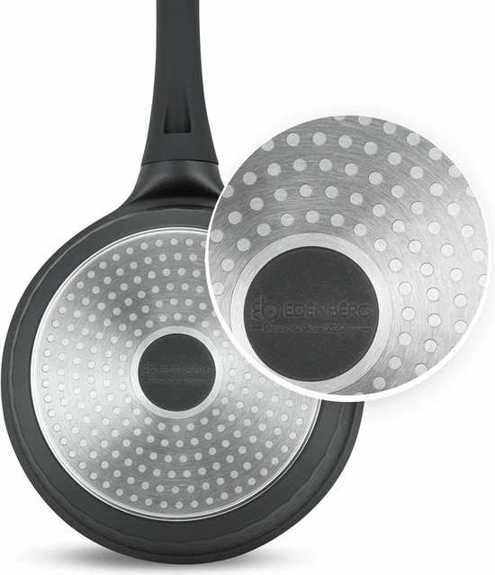 Deze prachtige pannenset van Edënbërg wordt geproduceerd onder de strengste Duitse normen en met het beste aluminium. De bodem is bedekt met maar liefst 3 lagen marmer met een mooie zwarte binnenkant die niet verkleurd. Dankzij de dikke bodem zijn de pannen zeer duurzaam en wordt het eten gelijkmatig verwarmd.
