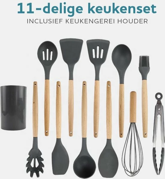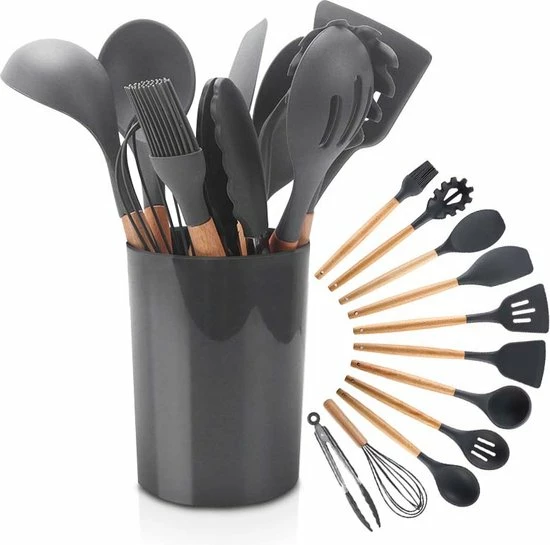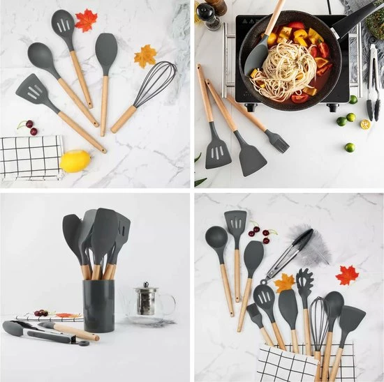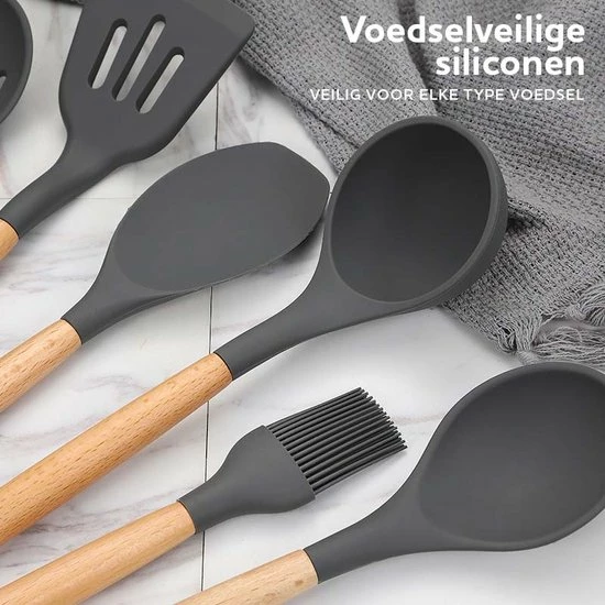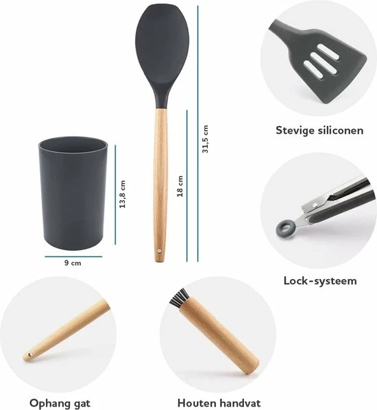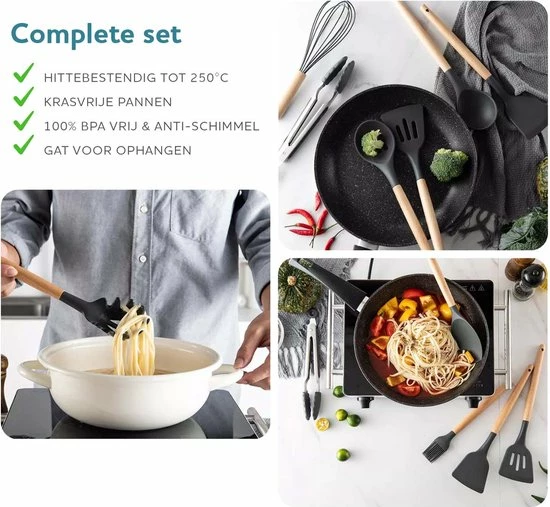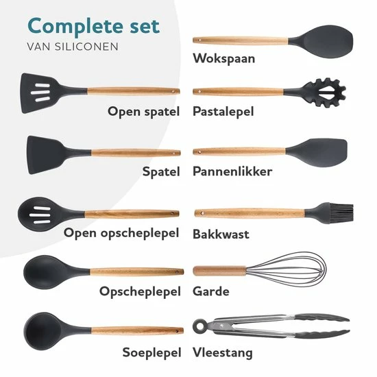 Om de anti-aanbak-laag van je pannen te beschermen, is alles wat met je pan in aanraking komt gemaakt van hittebestendig siliconen. De houten stelen liggen gemakkelijk in de hand en bieden de grip die je nodig bent.