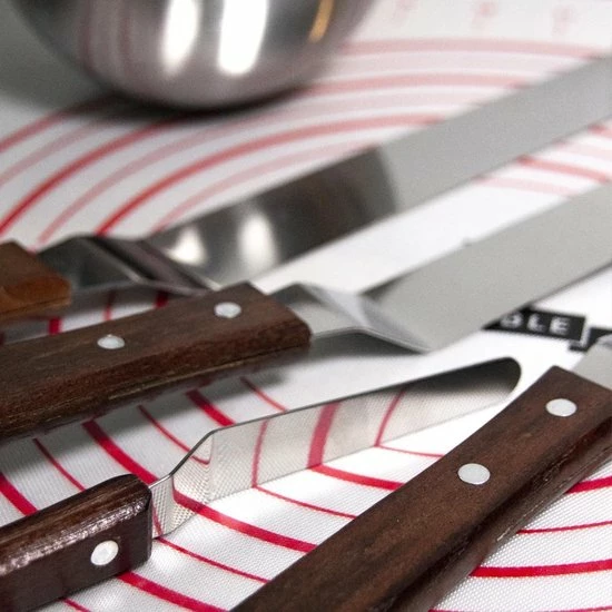 Met behulp van het glaceermes verdeel je een vulling gelijkmatig over een versgebakken cake of taart. Een goed laagje crème au beurre of liever wat confituur? Met het glaceermes smeer je het er vingerdik op.