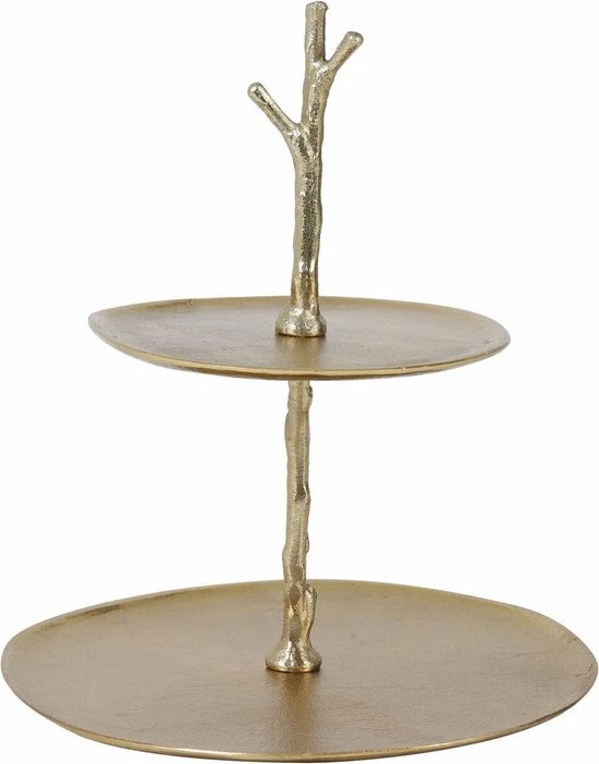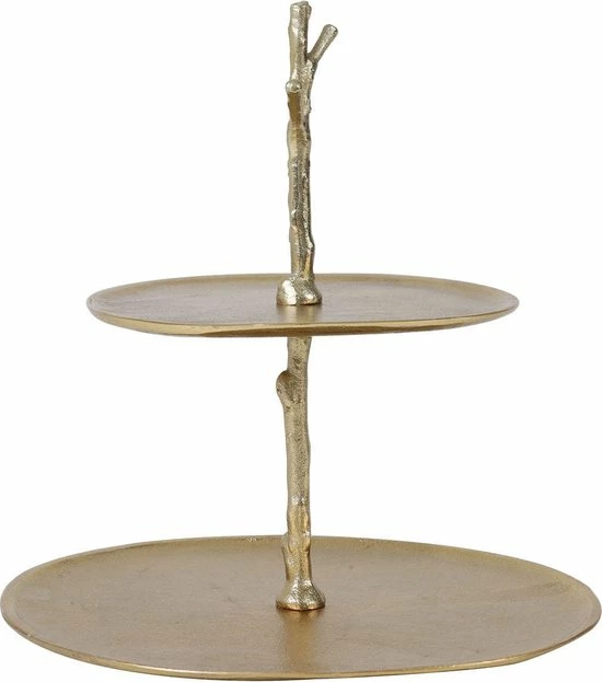 Etageres zijn multi functioneel. Leuk voor het serveren van lekkere hapjes en diverse zoetigheden zoals, koekjes en taartjes. Deze moderne etagere is perfect voor wanneer je visite krijgt. Deze gouden etagere met 2 lagen zal ook leuk staan op je eettafel met woonaccessoires, zoals theelichthouders. Dankzij de ruwe afwerking en de boomstam look valt hij extra op. Etagere Tresa van het merk Light & Living is gemaakt van metaal en heeft een hoogte van 31 cm en heeft een maximale breedte van 30,5 cm. (Niet geschikt voor in de vaatwasser)