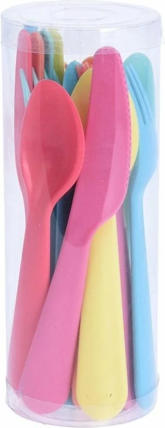 Een set met 18x onbreekbaar bestek voor bijvoorbeeld op de camping of tijdens de picknick, in verschillende kleuren. Bestaat uit 6 messen, 6 vorken en 6 lepels. Afmeting: ca. 16 cm. Materiaal: kunststof. Vaatwasser en magnetron bestendig. Voor meer producten uit deze serie zoekt u op de term: Gekleurd camping servies. Plastic kunststof servies voor op de camping of tijdens een picknick of BBQ.