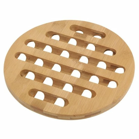 Een ronde onderzetter voor pannen. Materiaal: bamboe hout. Afmeting: ca. 20 x 20 x 1 cm. 4 Stuks.