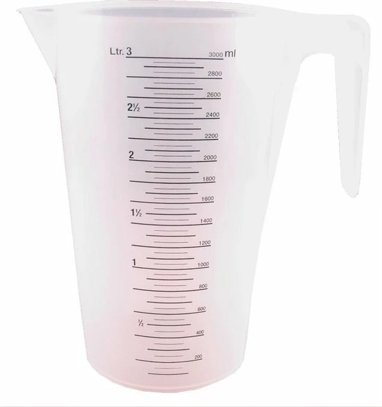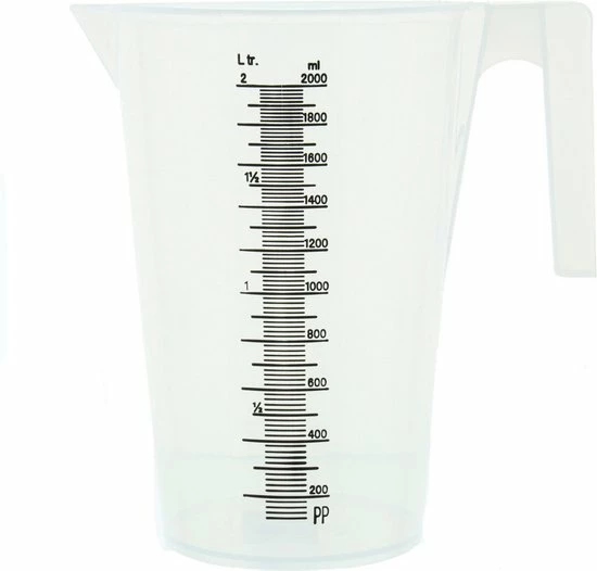 Maatbeker transparant 2 liter. Transparante maatbeker met een aanduiding tot 2 liter. Materiaal: kunststof. Inhoud: 2000 ml/200 cl/2 liter.