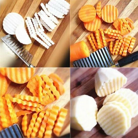 Met dit multifunctionele kartelmes kunt u voortaan heerlijke plakjes, blokjes of staafjes groenten, chips & frieten snijden in zig-zag formaat. Het golvende ontwerp zorgt niet alleen voor een stijlvolle indruk van uw gerechten, maar geeft bijvoorbeeld frietjes ook meer smaak omdat ze over een groter oppervlakte gebakken worden.
