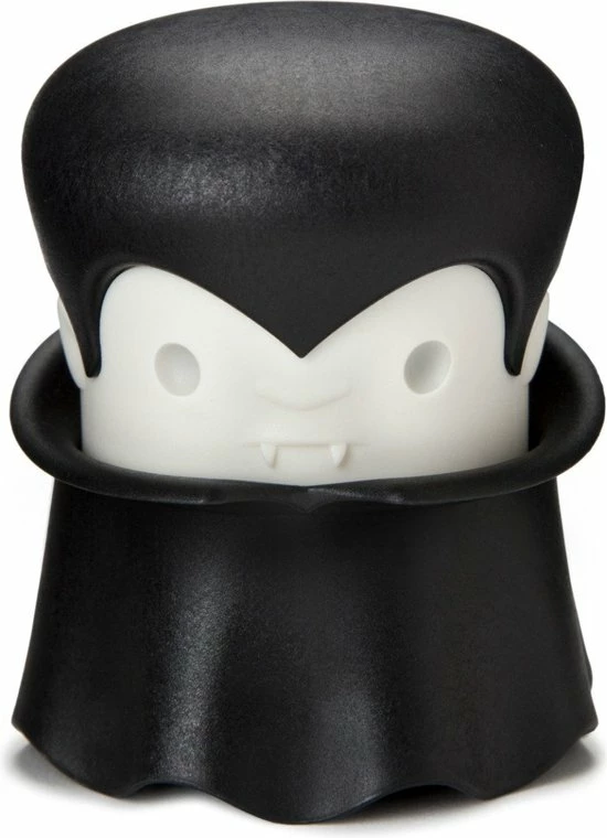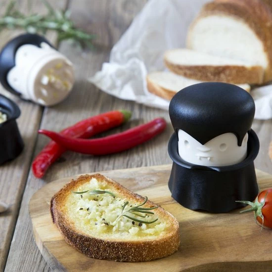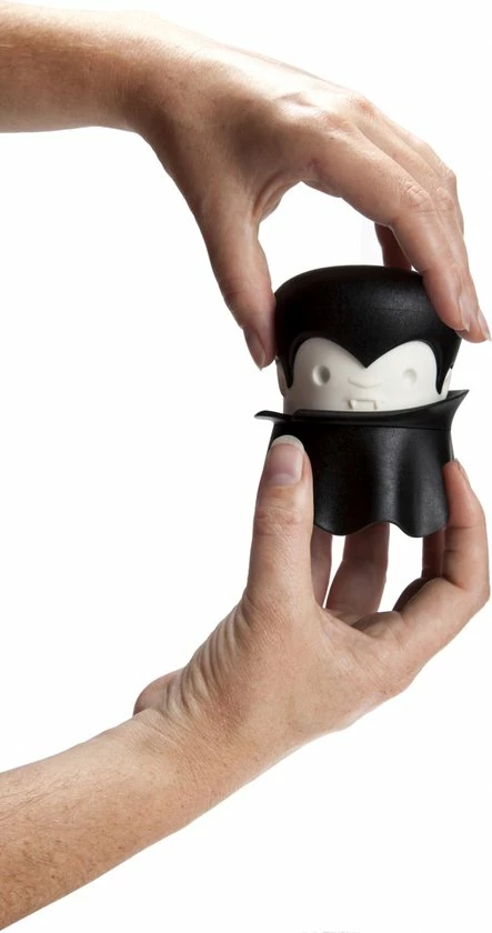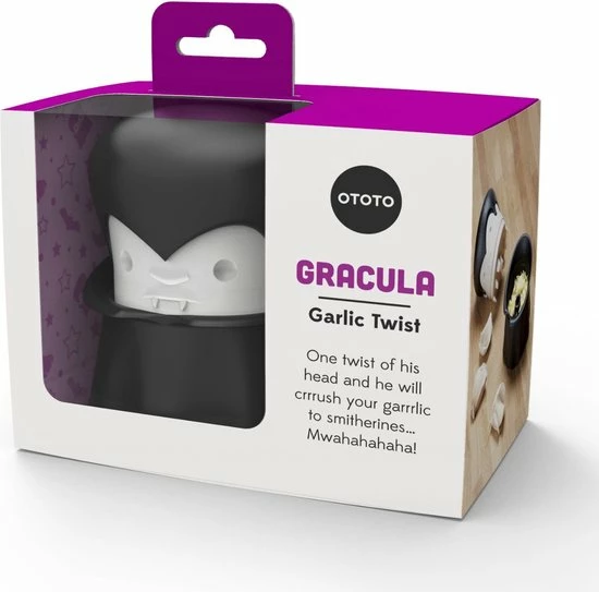Gracula knoflookpers van Ototo. Dit is een knoflookpers die eruit ziet als Dracula. Kleur: zwart met wit. De Gracula knoflookpers bestaat uit een hoofd en een bakje in de vorm van een cape. De knoflookteentjes worden uitgeperst door de tanden onder het hoofd. Stop de knoflook in het zwarte gewaad van de knoflook vampier, plaats zijn hoofd weer terug en draai één keer aan zijn hoofd. De knoflookteentjes zijn nu fijngemalen tot kleine stukjes. Vanuit het bakje is de knoflook snel en eenvoudig toe te voegen bij een gerecht. Gemaakt van polypropeen. Afmeting: 9,7 x 7,4 x 7,4 centimeter.