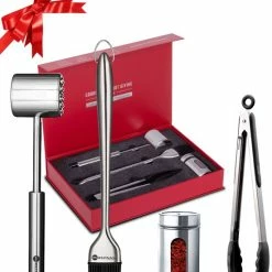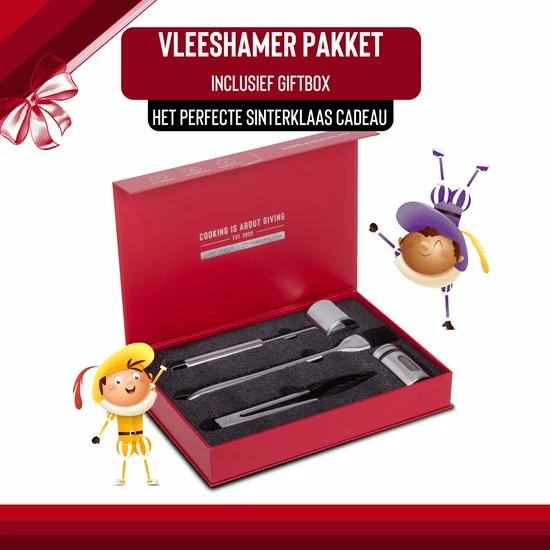 Inhoud: vleeshamer, vleestang, bakkwast, kruidenpotje, luxe geschenkverpakking
