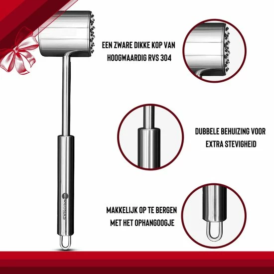 - Hoogste kwaliteit: hij is gemaakt van 304 RVS, dit is RVS van de hoogste kwaliteit en dit maakt deze vleeshamer super sterk en slijtvast. Ook is hij smaakneutraal.