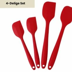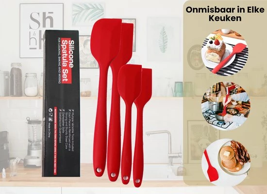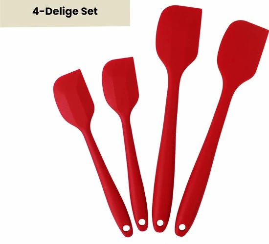 Deze 4 delige siliconen pannenlikker set is een must-have voor elke keuken! Of je nou een ambitieuze familie kok bent of een 3 sterren restaurant, deze pannenlikker set mag niet ontbreken in jouw keuken. Deze siliconen pannenlikker set bevat vier unieke spatels, in de kleur rood. Doordat er twee verschillende vormen zijn, zit er altijd wel één bij die van pas kan komen, tijdens het koken of tijdens het bakken.