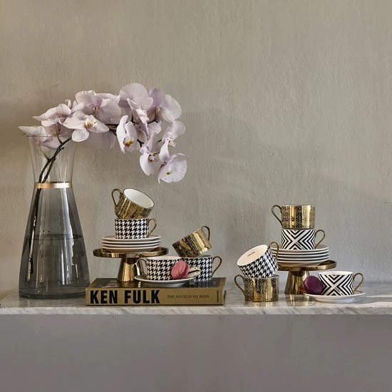 Kop-en-schotel L’Avenue Chevron met gouden oortje en een dun gouden randje. Ook het schoteltje is met goud versierd. Prachtig, alleen niet geschikt voor de vaatwasser. Het kopje heeft een zwart-wit strepenpatroon met schuine hoeken. Hier drink je heerlijk je warme drankje uit.