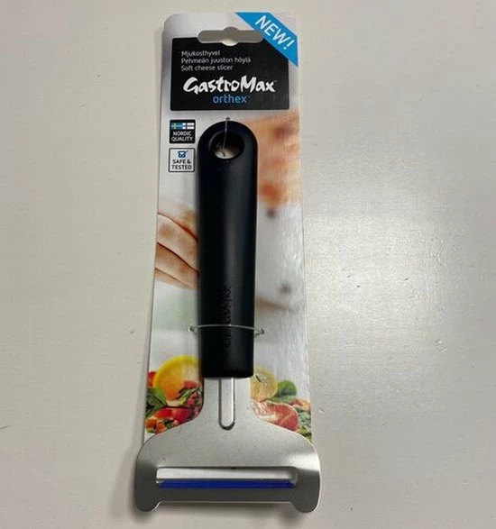 Roestvrijstalen kaasschaaf, speciaal voor het schaven van jonge, zachte kaas. Met comfortabel kunststof greep.