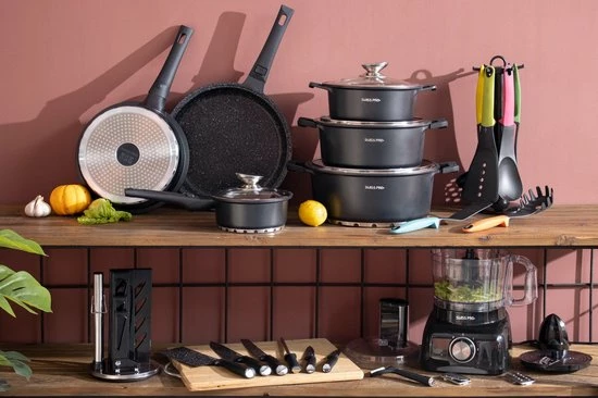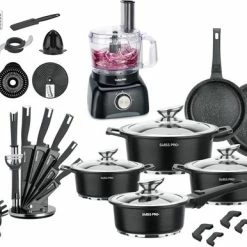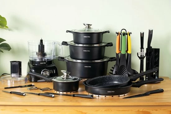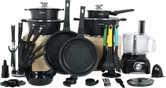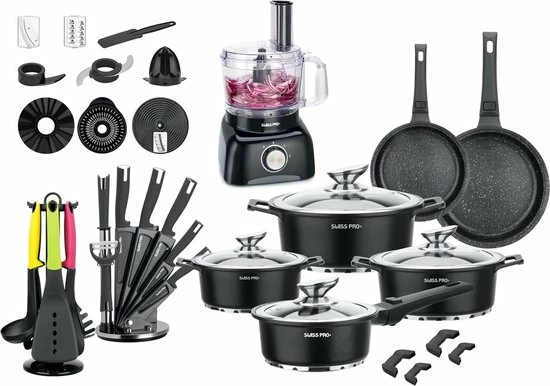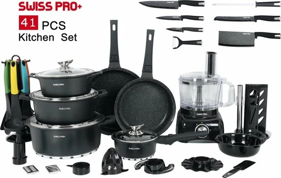 Swiss Pro+ – SWP41D22 – Pannenset 41 Delig – Foodprocessor – Messenblok 8 Delig – Kookgerei Set Met Houder 7 Delig – Starters Pakket – 2022 Serie – Limited Edition -uitzet